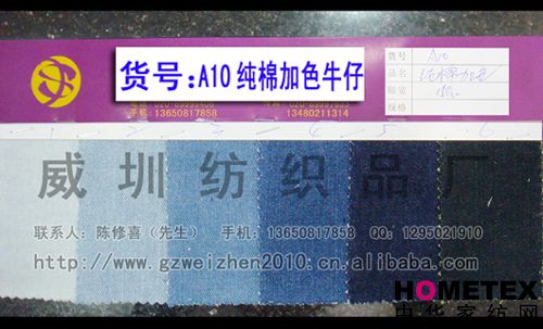幅寬:150cm 品名:純棉牛仔 密度:64*47 貨號(hào):A10純棉加色 重量:* 具體用途:休閑服、工作服、褲裝、時(shí)裝 別名:A10純棉加色 成分及含量:100%棉 主要用途:服裝用布 ======================================================================= 以上產(chǎn)品全部現(xiàn)貨供應(yīng),可隨時(shí)提供樣布卡和現(xiàn)貨,隨時(shí)發(fā)貨。所有產(chǎn)品全部是廠家直銷價(jià),我們承諾:以超低利潤(rùn)營(yíng)銷,我 們只求銷售量。為保證您的利益,我司建議您在采購(gòu)前先確認(rèn)我們的品質(zhì)樣與顏色樣后再拿大貨,期待與您的真誠(chéng)合作。因產(chǎn) 品種類較多,具體參考未盡詳盡,如有需要,請(qǐng)您與我們聯(lián)系。 瑞豐紡織(中大旗艦店)坐落于國(guó)內(nèi)最大的紡織面料產(chǎn)業(yè)中心—廣州中大,是一家專業(yè)銷售面料的廠家直銷商。主要經(jīng) 營(yíng)產(chǎn)品有:全棉凈色、仿記憶絲面料、全棉(TC)色織等,面料品種花達(dá)上千余種,所有產(chǎn)品全部現(xiàn)貨經(jīng)營(yíng)。 我們面料的品質(zhì)來(lái)源于:1、采用國(guó)內(nèi)外優(yōu)質(zhì)的原材料;2、使用精良的生產(chǎn)工藝和設(shè)備;3、完善的生產(chǎn)質(zhì)量管理體系。我 們具有開發(fā)和創(chuàng)新品種的強(qiáng)烈意識(shí)和優(yōu)越條件,并根據(jù)客戶需求與市場(chǎng)變化時(shí)時(shí)推出潮流面料。憑著多年的專業(yè)行業(yè)經(jīng)驗(yàn),根 據(jù)客戶需求,不論客戶在全國(guó)任何地方,只要提供小樣,就可在一兩天時(shí)間內(nèi)輕松獲得所需面料的信息。 批發(fā)說(shuō)明供應(yīng)商支持混批 。 ============================================================= 有意請(qǐng)加QQ:1295021910或電話聯(lián)系。 公司名稱:威圳紡織品廠 聯(lián)系人:陳修喜先生 手機(jī):13650817858 網(wǎng)址:http://www.gzweizhen2010.cn.alibaba.com =============================================================