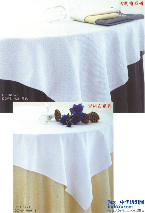 主要銷售客房;平紋 中,高檔【多種顏色40支-60支緞條】床單,被罩,枕套,枕芯,被子,墊被,床裙,床罩,床尾墊,浴簾以及毛巾系列。 餐飲系列;多種顏色中高檔 【純棉 方格 化纖 花色圖案】臺布 口布 臺墊臺裙 臺呢 椅套 印花臺布具有不褪色、耐洗、耐磨、色澤艷麗、平整挺括且使用壽命長的特點,印花臺布規格2.8m,表面繡有花朵圖案作裝飾,造型典雅、大氣,精美時尚,使整體更加美觀,深受廣大消費者的喜愛。白色印花臺布采用優質化纖材料制作而成,款式新穎、物美價廉,是酒店、賓館、家庭等場所的必備用品之一。本公司生產設備先進,工藝精良擁有多年的專業生產經驗 深受廣大消費者和采購單位的好評和信賴。